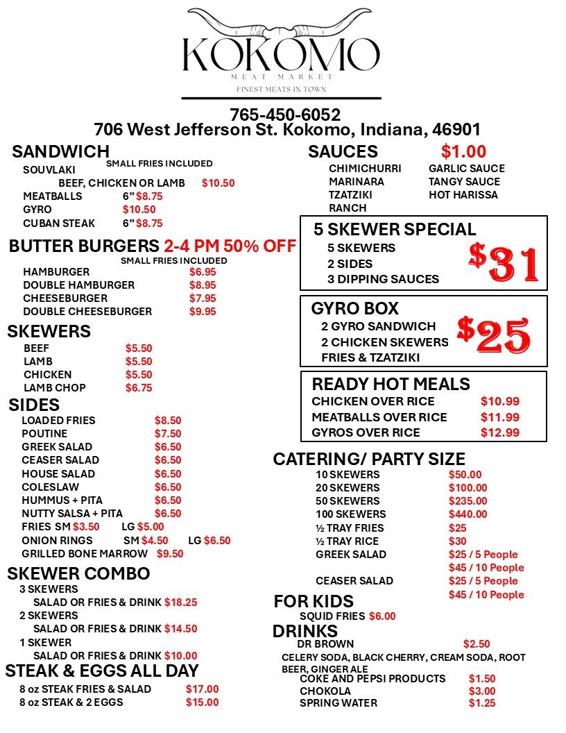 Kokomo Meat Market is your local, full-service butcher shop proudly serving the Kokomo and Howard County community. We specialize in fresh-cut meats, freezer beef, jerky, and specialty items prepared with care and quality you can taste. Our team combines small-town service with expert craftsmanship — offering custom cuts, processing, and even hot meals and grill options right from our shop. Whether you’re stocking your freezer, grabbing dinner, or looking for something special, Kokomo Meat Market brings the best farm-to-table flavors to your table..